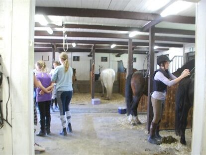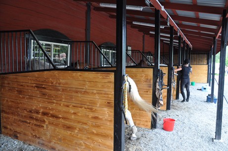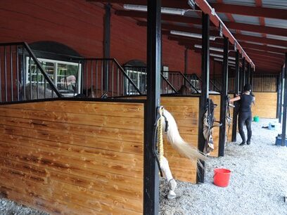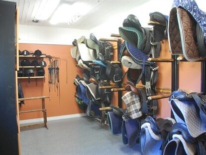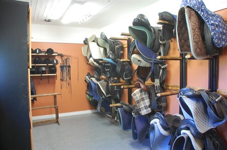 Hästarna bor i riktiga stallar där varje häst har sin plats. När inte hästarna står inne för ridning så betar de runt gården, så nära till hästen det kommer du alltid ha! Dessutom kan vi njuta av ett designad utrymme för utrustningen, där ryms både sadel, träns , benskydd och täcken.